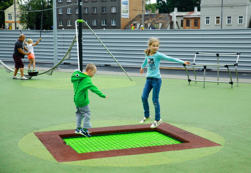 Centra sporta kvartāla kopējā teritorija ir četri hektāri, no kuriem 7000 kvadrātmetros ir izveidots viens no lielākajiem rotaļu laukumiem bērniem. Tajā ir uzstādītas dažāda veida rotaļu iekārtas un elementi, kas domātas divu vecuma grupu bērniem - vecumā līdz 7 gadiem un no astoņu gadu vecuma. Rotaļu laukuma vizuālajā noformējumā izmantoti Rīgas simboli un vēsture. Rotaļu laukuma labiekārtošanas darbus pēc Rīgas domes Īpašuma departamenta pasūtījuma veica SIA "Jūrmalas mežaparki”.