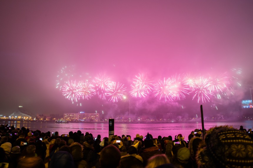 Tieši gadu mijā varēja vērot muzikālu uguņošanas priekšnesumu, kuru pavadīja operdziedātājas Sonoras Vaices, vijolnieka Raimonda Ozola, grupas "Latvian Voices", dūdu un bungu grupas "Auļi", dīdžeja Monstas, hiphopa mākslinieka Reika un Kristapa Krievkalna muzikāli mākslinieciskais sniegums. Pēc svētku uguņošanas svinības turpinājās kopā ar grupu "Buks" un dīdžeju Robertu Lejasmeijeru.