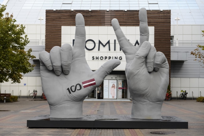 Lai apsveiktu rīdziniekus un pilsētas viesus Latvijas Valsts simtgadē, izveidots nebijis pilsētvides objekts – divas 4 metrus augstas rokas, kas ir lielākā dabā apskatāmā un aptaustāmā roku skulptūra Latvijā. Roku pirkti simboliski rāda Latvijas abreviatūru “LV”, un par to modeli kļuva Latvijas lepnums – bokseris Mairis Briedis.