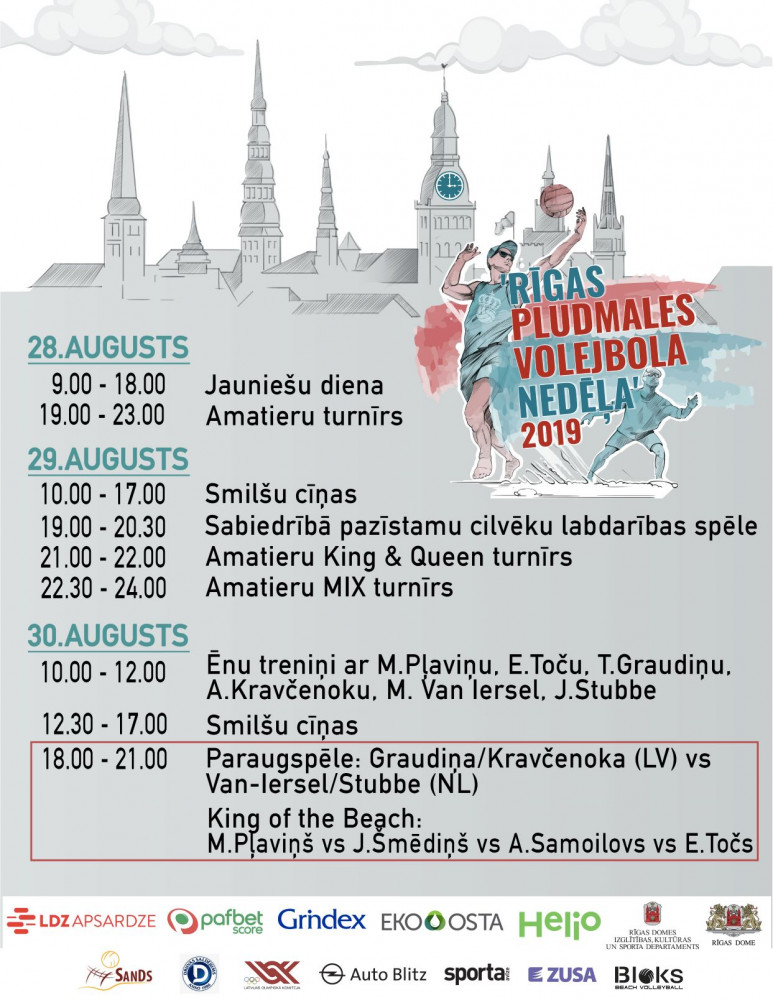 Viens no gaidītākajiem mirkļiem būs šī gada Eiropas čempioņu Tīnas Graudiņas un Anastasijas Kravčenokas spēle ar volejbolistu pāri no Nīderlandes - Marlēnu Ramondu Van Jerselu (Marleen Ramond-Van Iersel) un Džoju Stubi (Joy Stubbe). “Iespēju spēlēt pludmales volejbolu pašā pilsētas centrā un vietā ar vēsturisku nozīmi, mēs nevarējām palaist garām!” tā Latvijas pludmales volejboliste Tīna Graudiņa stāsta par ideju dalībai Rīgas pludmales volejbola nedēļā. Vēl pirms pludmales volejbolistes kļuva par Eiropas čempionēm, viņas uzrunāja pasākuma organizatorus ar vēlmi piedalīties. Arī pagājušajā gadā volejbolistes sekoja līdzi pasākumam Doma laukumā, uzslavējot tā kvalitāti un ideju. Anastasija Kravčenoka turpina “Pludmales volejbola laukums pašā Rīgas centrā ir ekskluzīvi, tāds arī bija šis pasākums pagājušajā gadā. Šogad man un Tīnai ir dota iespēja izbaudīt ekskluzīvu pludmales volejbola atmosfēru Rīgas centrā un, protams, mēs mēģināsim sagādāt pozitīvas emocijas mūsu atbalstītājiem.” Paraugspēli Graudiņa/Kravčenoka pret Van-Iersel/Stubbe varēs noskatīties 30.augustā plkst.18.00.