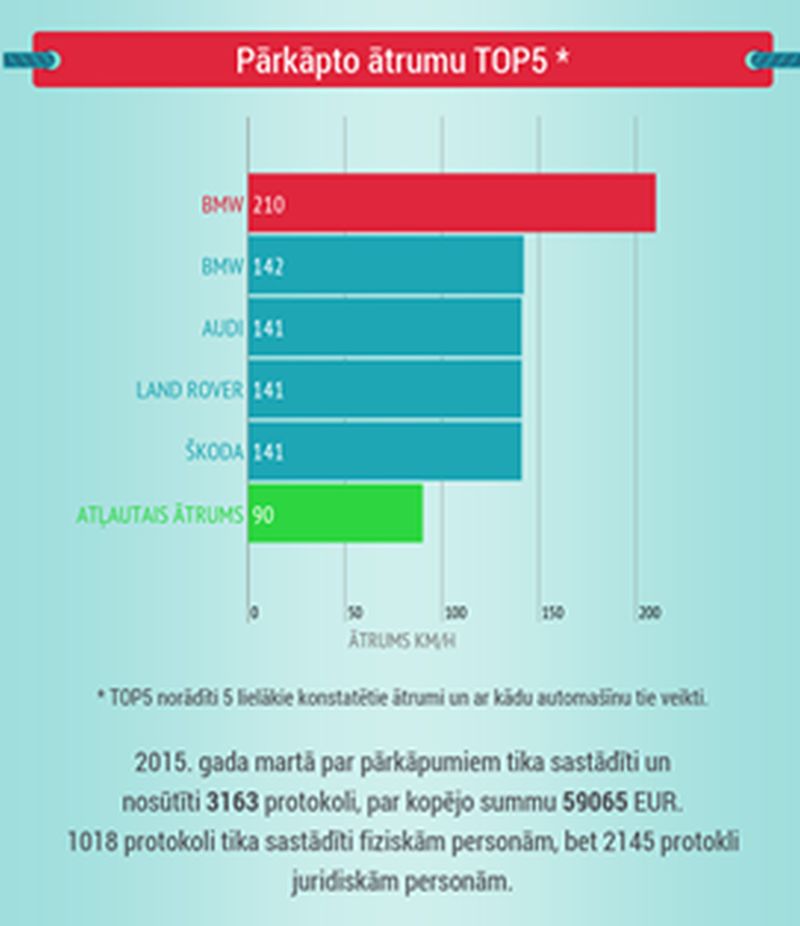 Valsts Policija publicējusi visai interesantu infografiku, kura parāda – vislielākie ātruma pārkāpēji ir BMW automašīnu īpašnieki, turklāt martā fiksēts šogad lielākais ātruma pārkāpuma rekords - 210 km/h.