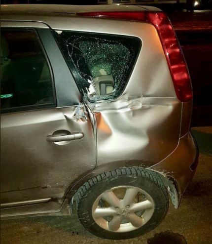 Automašīnai sānā izveidojusies pamatīga bukte un izsists stikls. Ruslans min, ka, iespējams, kāds autovadītājs nav prasmīgi apgriezis savu spēkratu un trāpījis pa ielas malā novietoto auto.