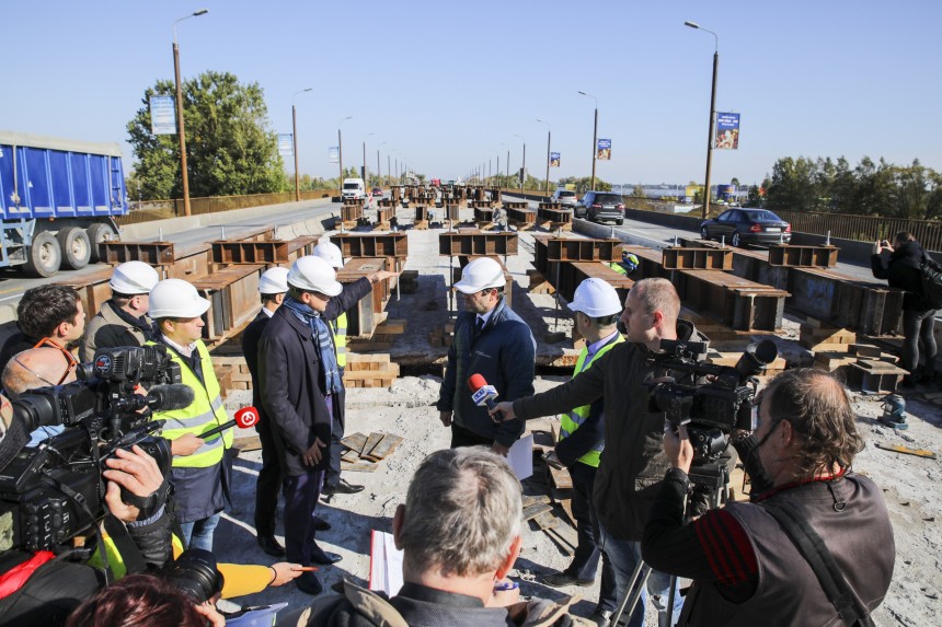 Salu tilts vakar kļuva par platformu, no kuras Rīgas domes priekšsēdētājs Nils Ušakovs un Rīgas domes Satiksmes departamenta pienākumu izpildītājs Emīls Jakrins rādīja un stāstīja par aizejošajā satiksmes būvju remontu sezonā paveikto un uz nākamo sezonu iecerēto.