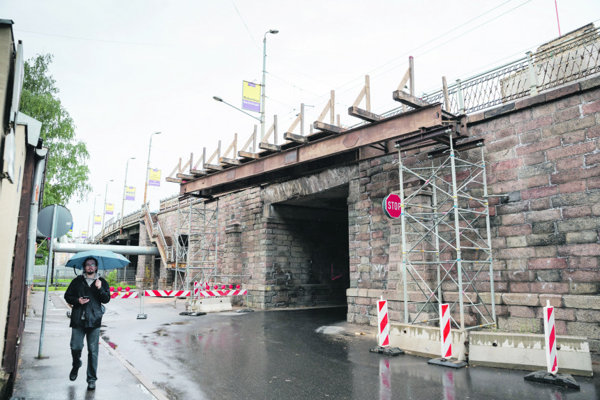 Arī šis neatliekami veicamais remonts iekavējās, jo vajadzēja padomāt, kā tiltu remontēt, iztiekot bez ietvju slēgšanas. Turklāt arī trepes bija slēgtas, jo būvvaldei radās iebildumi pret to tehnisko stāvokli. Trepēm kaut ko pieremontēja, un drosmīgie, kas nebaidās pa neērtajiem pakāpieniem novelties, tās atkal drīkst izmantot. Taču palaist visus tilta gājējus, velosipēdus un elektroskrejriteņus pa vienu pusi tāpat būtu neiespējami, jo ietves ir šauras, turklāt tām pa vidu vēl sasprausti elektrotransporta kontaktvadu stabi. Tilts uzprojektēts vienkārši briesmīgi un tagad vēl galīgi izļodzījies. Būvnieki no Rīgas tiltiem ir atraduši citu risinājumu, kā remontu veikt, neapturot jau tā neērto pārvietošanos pa ietvēm. Proti, no ārpuses tiltam pieliktas stalažas. Gājēji un dažādi braucamrīki varēs pārvietoties pa platformām. Izklaide Mežakaķa stilā.