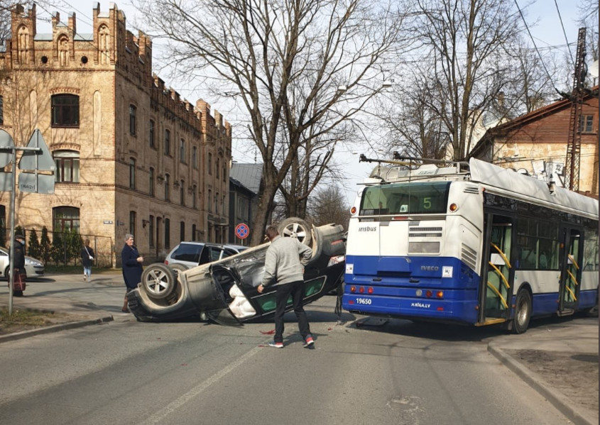 Divu vieglo automašīnu un trolejbusa sadursme dēļ, Rīgā traucēta satiksme Melnsila un Kapseļu ielu krustojumā.