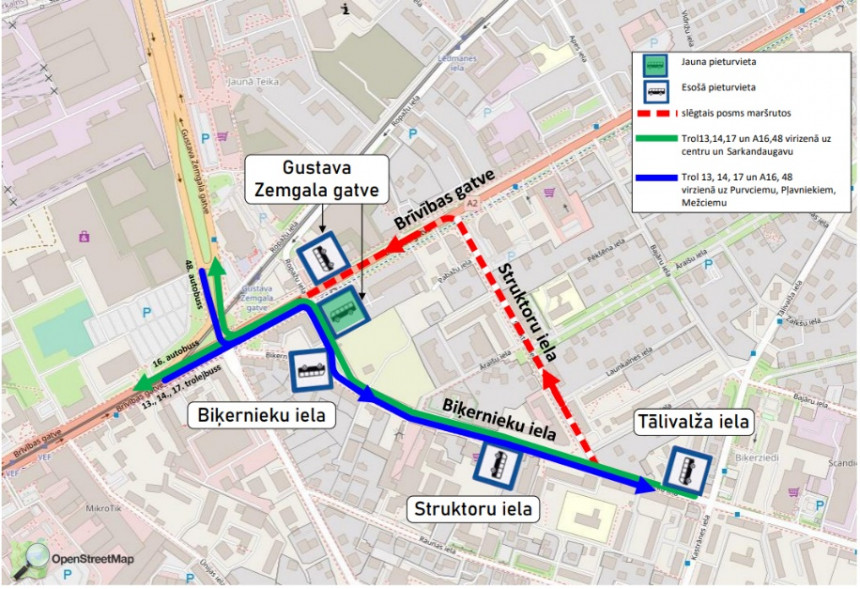 Lai uzlabotu sabiedriskā transporta kustības ātrumu un mazinātu sastrēgumu ietekmi uz kustības saraksta izpildi no 23. augusta 13., 14., 17. trolejbusa un 16. un 48. maršruta autobusi virzienā no Ieriķu ielas, Mežciema, Purvciema, Papīrfabrikas “Jugla” un Pļavniekiem kursēs pa maršrutu līdz Biķernieku ielai, tālāk pa Biķernieku ielu, Viļa Ģelbes ielu, Brīvības gatvi un tālāk pa maršrutu. Viļa Ģelbes ielā (pirms krustojuma ar Brīvības gatvi) tiks izveidota jauna pieturvieta “Gustava Zemgala gatve”, informē "Rīgas satiksme".
