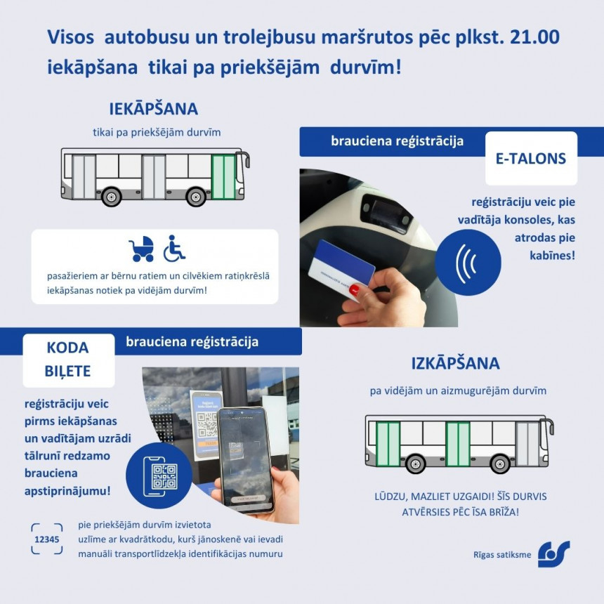 Jau ziņots, ka no 1.augusta visos autobusu un trolejbusu maršrutos vakaros pēc plkst. 21.00 iekāpšana transporta līdzeklī notiek tikai pa priekšējām durvīm un brauciens jāreģistrē pie vadītāja konsoles. Pasažieriem, kuri braucienu apmaksā ar koda biļetes lietotni, biļetes reģistrācija jāveic jau kāpjot transportlīdzeklī un vadītājam tikai jāuzrāda tālrunī redzamais brauciena maksas apstiprinājums. Tādējādi vadītājs seko līdzi, lai visi pasažieri veiktu reģistrāciju un samaksātu par braucienu.