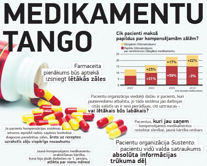 Pēc Nacionālā veselības dienesta (NVD) datiem, pēdējos gados strauji pieaudzis pacientu obligāto maksājumu apmērs, arī papildu līdzmaksājums par dārgākiem, tas ir, nereferences medikamentiem. Visvairāk tas pieauga 2009. gadā, jo vairākām slimībām kompensācijas apmēri samazināti no 75 līdz 50% – obligāto maksājumu apmērs pieauga par 60%. Ziņojumā valdībai VM norāda: veicot izmaksu samazināšanas pasākumus, piemēram, iekļaujot sarakstā lētākas ģenēriskās zāles, samazinot jau iekļautu zāļu cenas, tika panākts obligātās pacientu līdzmaksājuma daļas samazinājums. Tomēr saglabājas tendence palielināties tai pacientu līdzmaksājuma daļai, ko pacienti samaksā, iegādājoties dārgākās zāles.