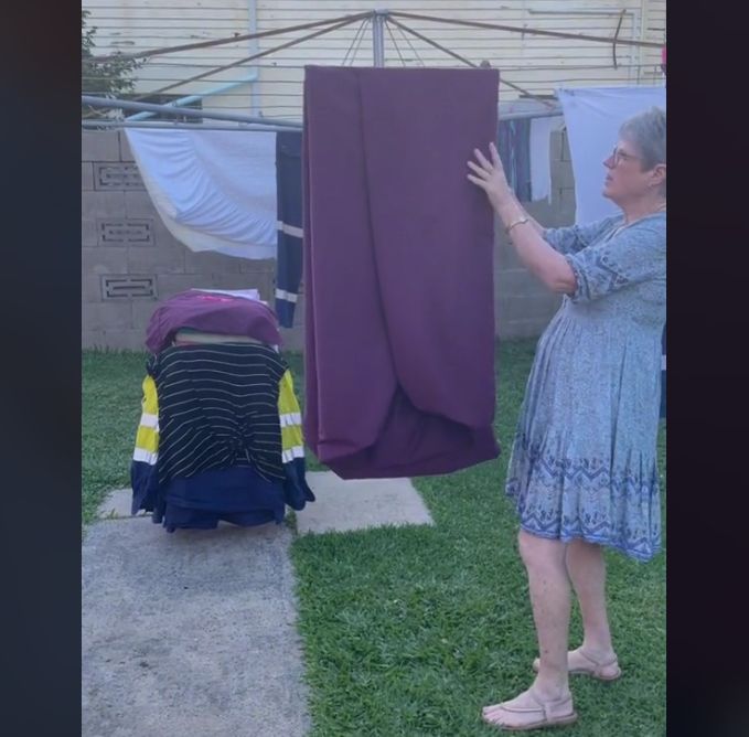 Video redzams, ka sieviete to dara, kamēr palags atrodas izkārts uz veļas auklas.