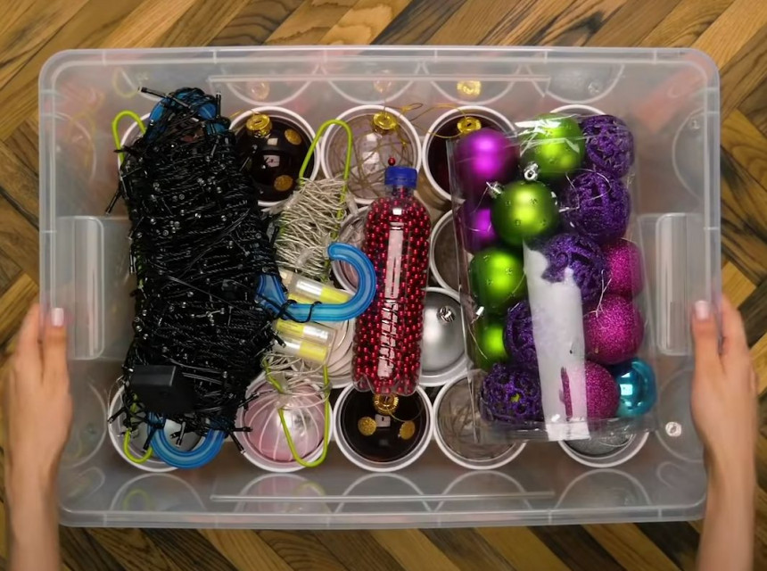 Lai tās nākamgad būtu iespējams vieglāk pārskatīt, bumbas vai cita veida mantiņas rotājumu kastē, ņem talkā lielā izmēra plastmasas glāzes. Ar līmi tās piestiprini kastes apakšai un tajās saliec bumbas. Šādi tās vari izkārtot pēc krāsām vai citiem parametriem. Turklāt, atverot kasti, viss būs labi pāredzams un bumbas viegli aizsniedzamas.