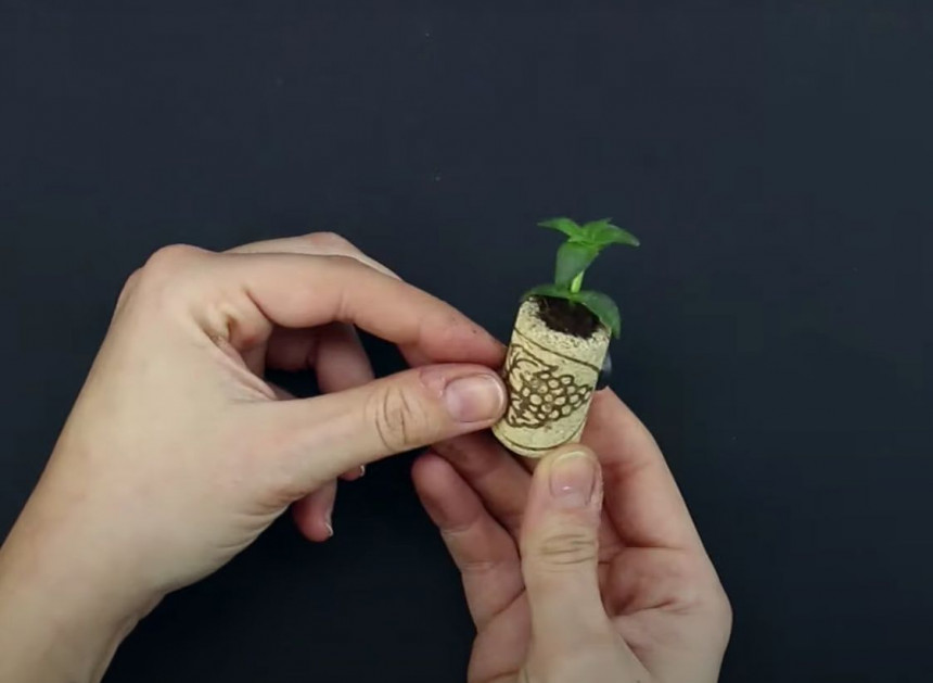 Kad korķī caurums ir izgrebts, ņem maza izmēra augu un ieliek izgrebtajā caurumā. To iestiprina ar melnzemi.