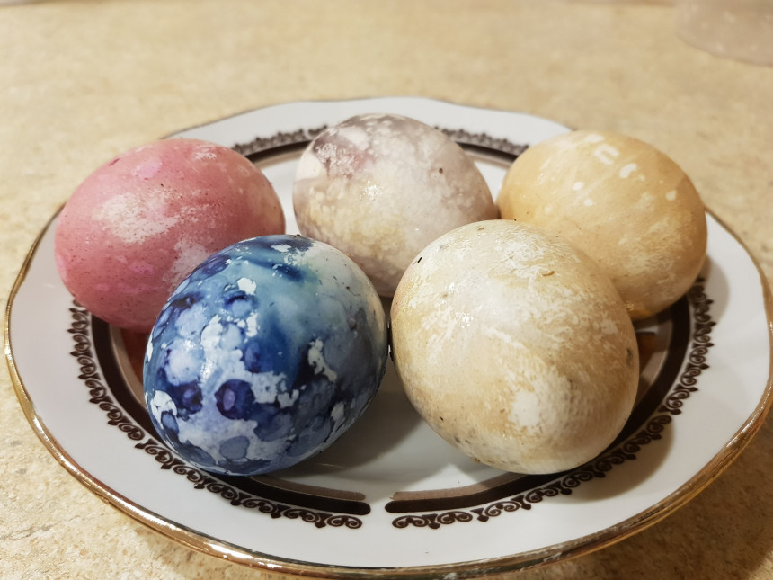 Rezultāts: Nav slikti! Gribētos izteiksmīgāku vīnogu sulas krāsu, bet raksts no putraimiem sanācis vienreizējs un ola ieguvusi pelēku nokrāsu.