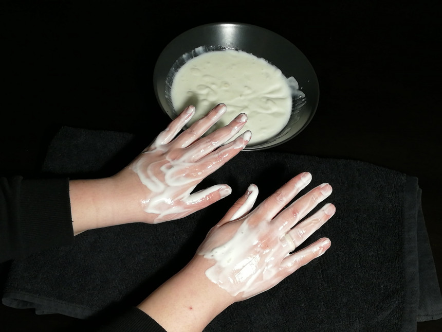 Iezied rokas bagātīgi ar masku un tā paturi kādas 20 minūtes. Internetā uzietajā avotā bija norādīts, ka jāgaida, kamēr maska sakalst, taču eksperimenta laikā maska tā arī nesakalta.