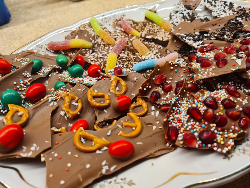 Izkausētās šokolādes masu izlej uz pannas, kurā ieklāts cepampapīrs. Tad laiks rotāšanai! Izmantotas gan granātābola sēkliņas, kokosa skaidiņas, želejas konfektes, saldās "skaidiņas", šokolādes dražejas un citi kārumi! Piemēram, sāļajiem cepumiem un šokolādes dražejām var radīt briedīšu konfektes! / lifehacks.lv