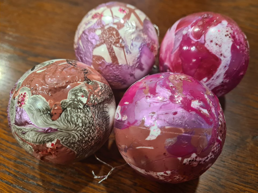 Šajā eksperimentā izmantoju tā saukto "watermarbeling" metodi, kura aizgūta no skaistuma "jūtuberiem" un meistariem, kuri šo triku izmanto manikīrā - ar ūdens un nagu lakas palīdzību iegūst unikālus nadziņu dizainus. Šoreiz nagus nemērksim, bet gan Ziemassvētku eglīšu rotājumus - bumbas!