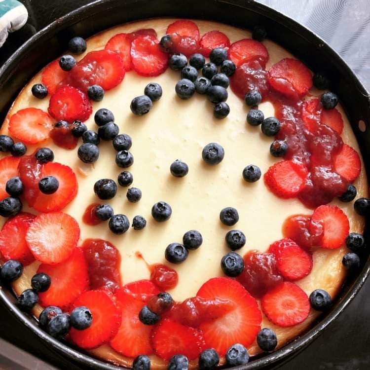 Gatavo pildījumu: krēmsieru, olas un saldinātāju rūpīgi sajauc, veidojot viendabīgu masu. Šajā posmā papildus garša vai smaržai var pievienot, piemēram, vaniļas ekstraktu, ruma aromatizētāju vai ko citu pēc saviem ieskatiem. Ielej formā pāri pamatnei.