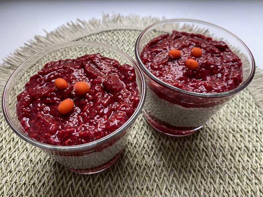 Pašās beigās atliek vien trauciņā kārtot desertu. Pirmajā kārtā lieciet ogu mērci, pa virsu tai čia pudiņu un pašās beigās atkal ogu mērci.
