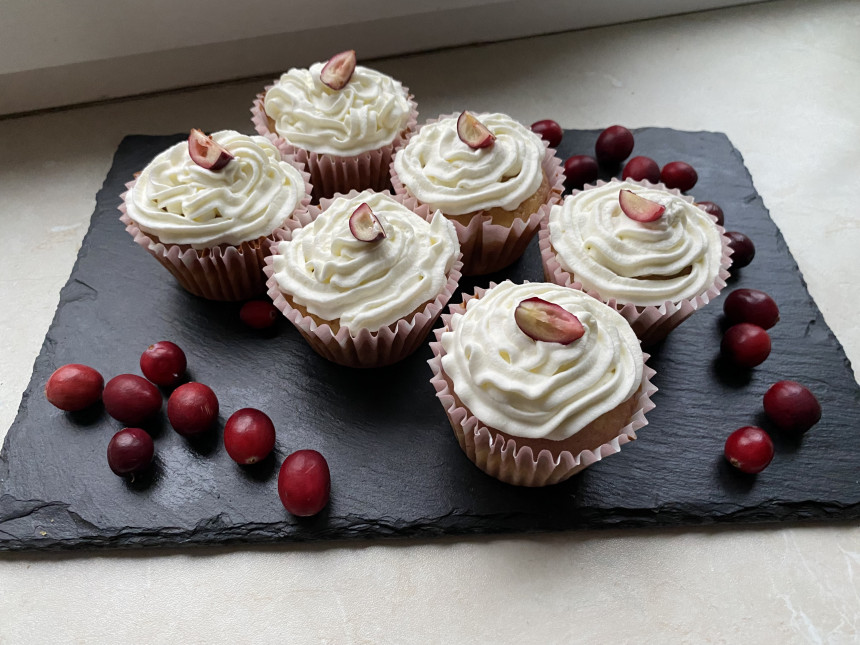 Kad putukrējums gatavs, kārtojiet kēksiņus uz šķīvja, tiem virsu lieciet putukrējumu un dekorējiet ar ogām. Mēs izmantojām lielogu dzērvenes!