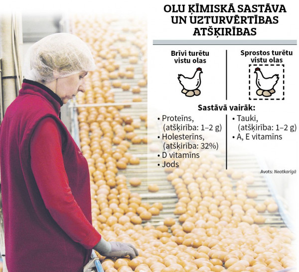 Kā atšķiras sprostos turētu un brīvi staigājošu vistu olas?