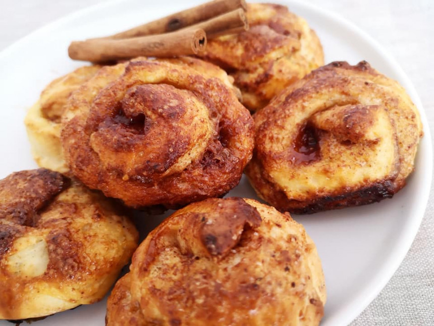 - Kanēļa bulciņas apsmērē ar olu un liek cepties iepriekš sakarsētā cepeškrāšnī.