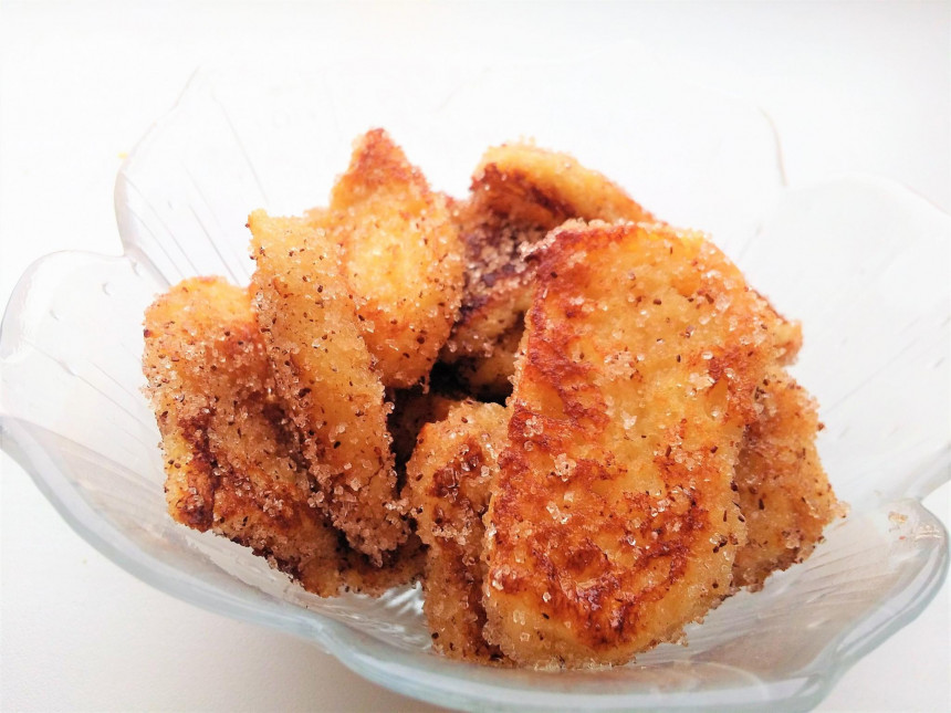 Kubiņus apcep no abām pusēm, un uzreiz apviļā cukura un kanēļa maisījumā.