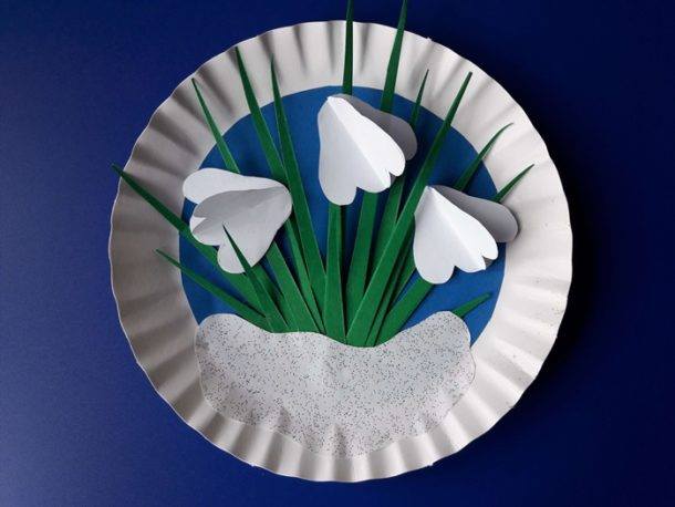 Visbeidzot, piestiprini pie zilā fona zāles stiebriņus, sniegpulkstenītes, sniedziņu. Dekoratīvais šķīvītis ir gatavs!