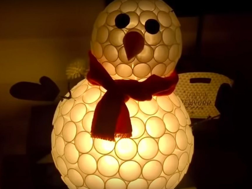 No plastmasas glāzītēm iespējams izveidot neparastu sniegavīra dekoru, kas, turklāt, varēs kalpot arī kā dekoratīva lampa. Vajadzēs vien divu izmēru baltas plastmasas glāzītes (lielākas un mazākas), skavotāju, karsto līmi un aplikācijas papīru. Ķeramies klāt!