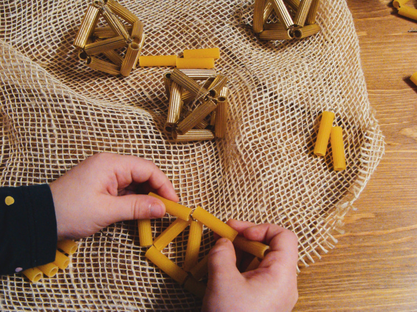 Caur trīs Rigatoni rigate makaroniem izvij auklu un stingri sasien mezglu, iegūstot pirmo trijstūri un atstājot vienu auklas galu aptuveni 35 cm garu.