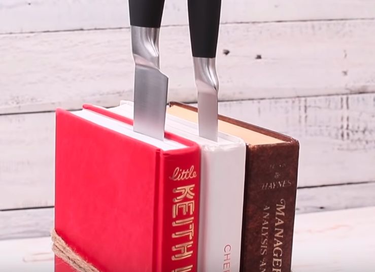 Izgatavoto nažu turētāju novieto vertikāli uz galda. Starp grāmatu lapaspusēm tagad varēsi viegli ievietot nažus. Skaisti un praktiski!