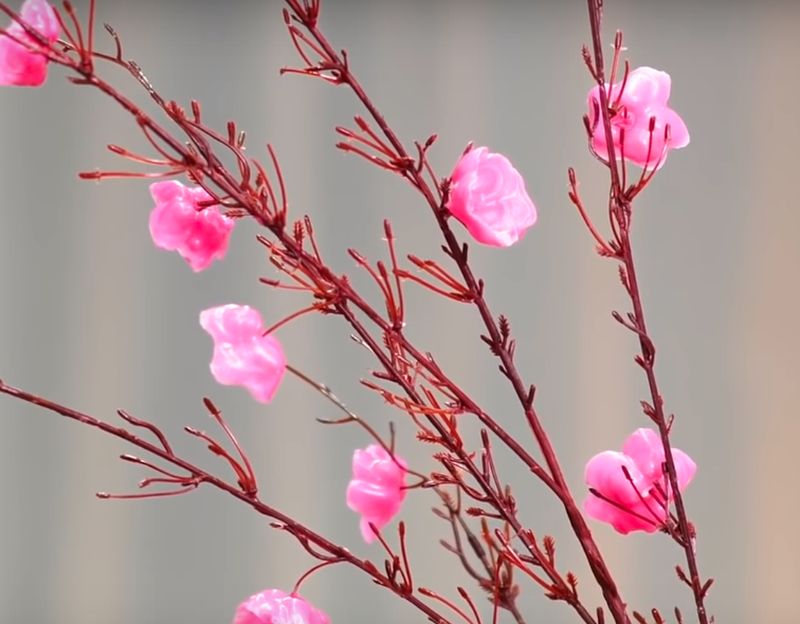 Visbeidzot, ar līmes palīdzību, piestiprini vaska ziedus pie sausa zara vai smilgām. Izkārto vaska figūras uz zara tā, lai tās radītu "dabisku ziedu" efektu.