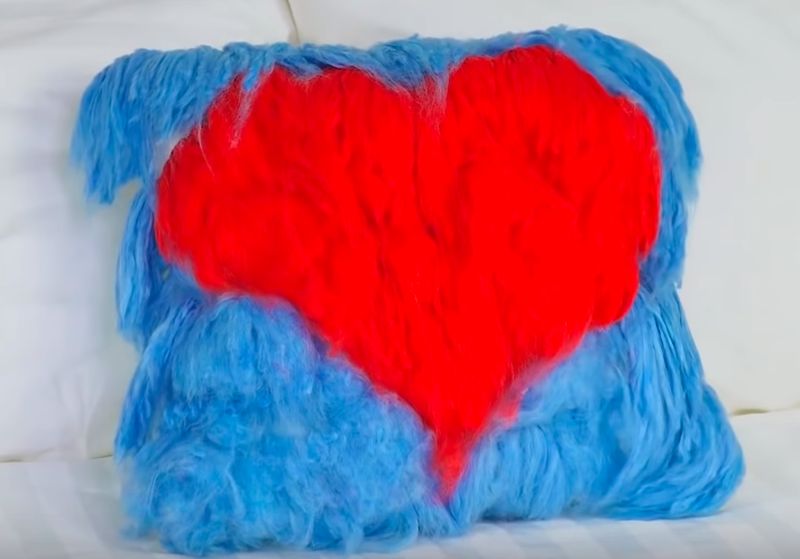 Kad visi dziju pušķi šādi "izķemmēti", ar karstās līmes palīdzību piestiprini tos pie spilvendrānas sev vēlamajā zīmējumā. Tā kā tuvojas Valentīna diena, tad vari radīt spilvendrānu tieši par godu šiem svētkiem, izkārtojot sarkanas krāsas dzijas pušķus sirds formā un tad tai apkārt līmēt pušķus sevis izvēlētajā fona krāsā.