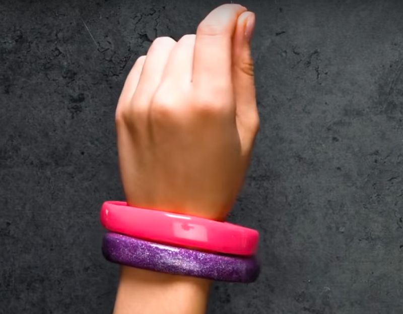 Visbeidzot ņem talkā nagu laku, lai piešķirtu rokassprādzei krāsu. Nagu laku klāj plastmasas riņķa iekšpusē. Kārtīgi noklāj visu rokassprādzi, lai rezultāts izskatītos pēc iespējas efektīgāk. Ļauj nagu lakai nožūt.