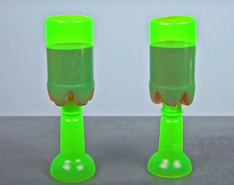 Pie ar līmi noklātās daļas piestiprini otru pudeles daļu ar tās apakšu pret pudeles korķa daļu.