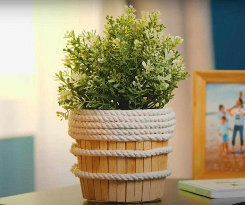 Beigās ar virvi notin spaiņa augšdaļu. Šādi iegūsi pievilcīgu puķu podu, vāzi vai spainīti dažādiem sīkumiem, kuru novietot redzamā vietā.