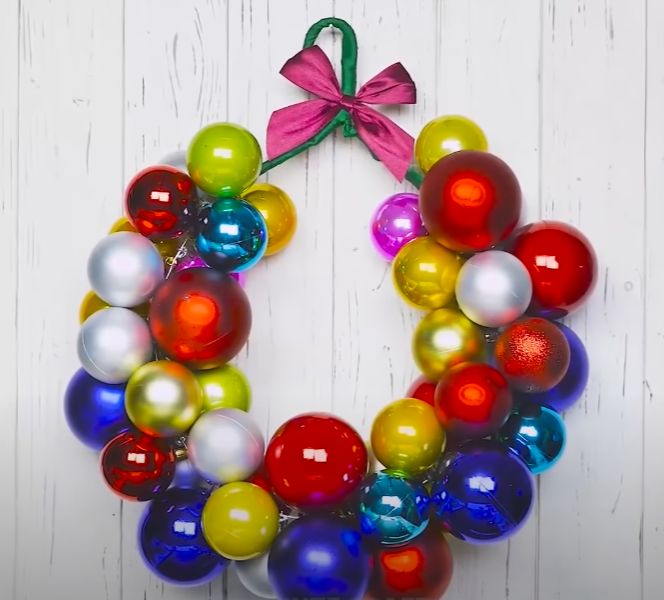 Caur īsāko galu uzver uz pakaramā Ziemassvētku rotājumus. Droši kar tos lielā daudzumā, tad vainags izskatīsies bagātīgāks un nebūs redzama metāla stieple.