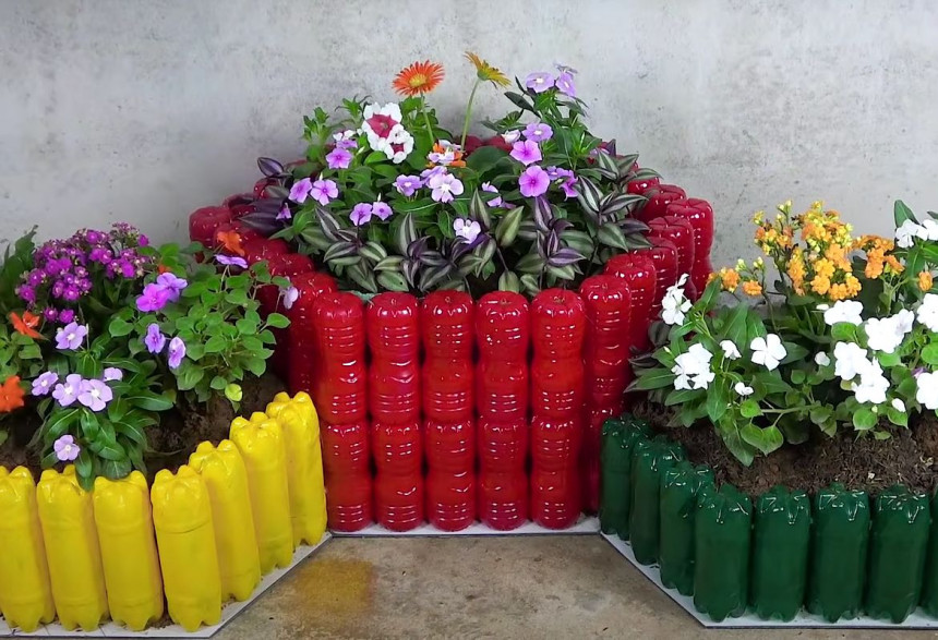 Plastmasas pudeles iespējams izmantot arī dārzā, piemēram, iespaidīga puķu poda izveidošanai.