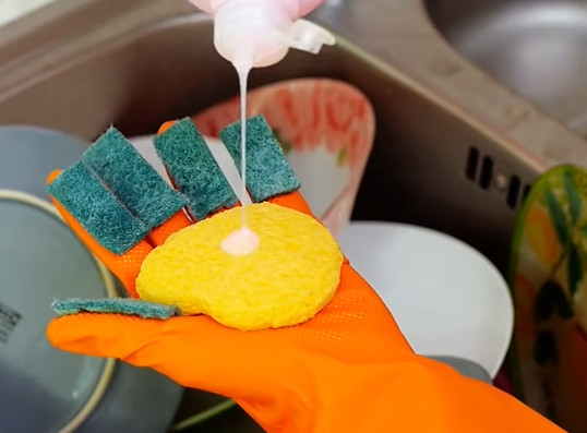 1. Paņem trauku švammi un noplēs nost abrazīvo pusi (skat. attēlā).