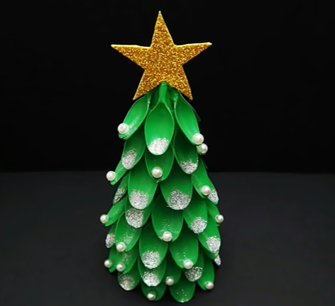 8. Lai egle būtu pabeigta, nepieciešams veikt vēl vienu soli. No kartona nepieciešams izgriezt zvaigzni. Izgriezto zvaigzni ar karstās līmes palīdzību pielīmē klāt egles virsotnei. Eglīte gatava!