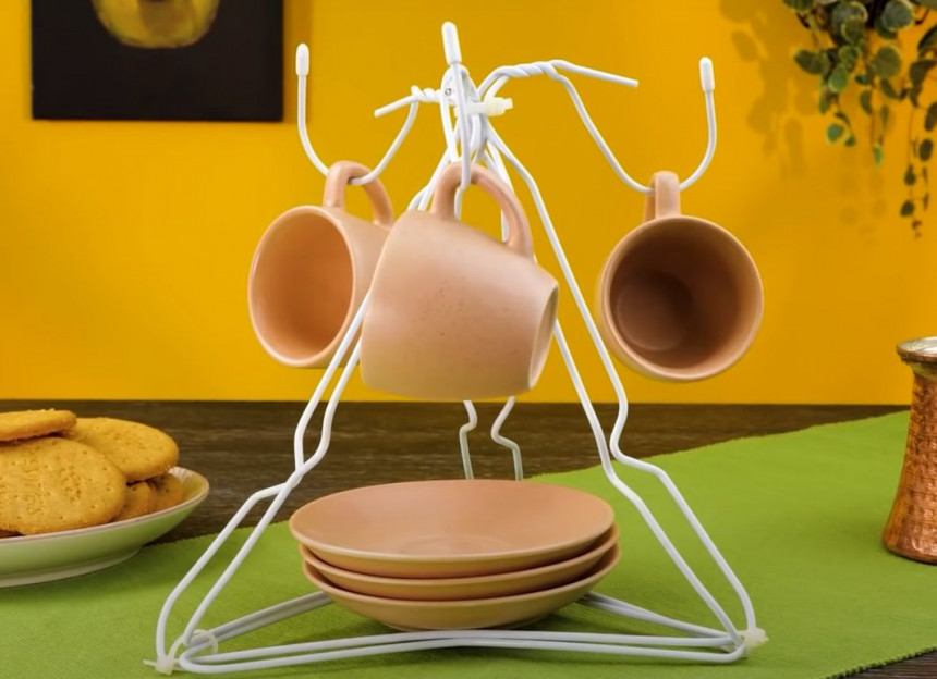 Centrā vari novietot šķīvjus, bet krūzītes aiz osām vari uzkārt uz nolocītajiem āķiem.