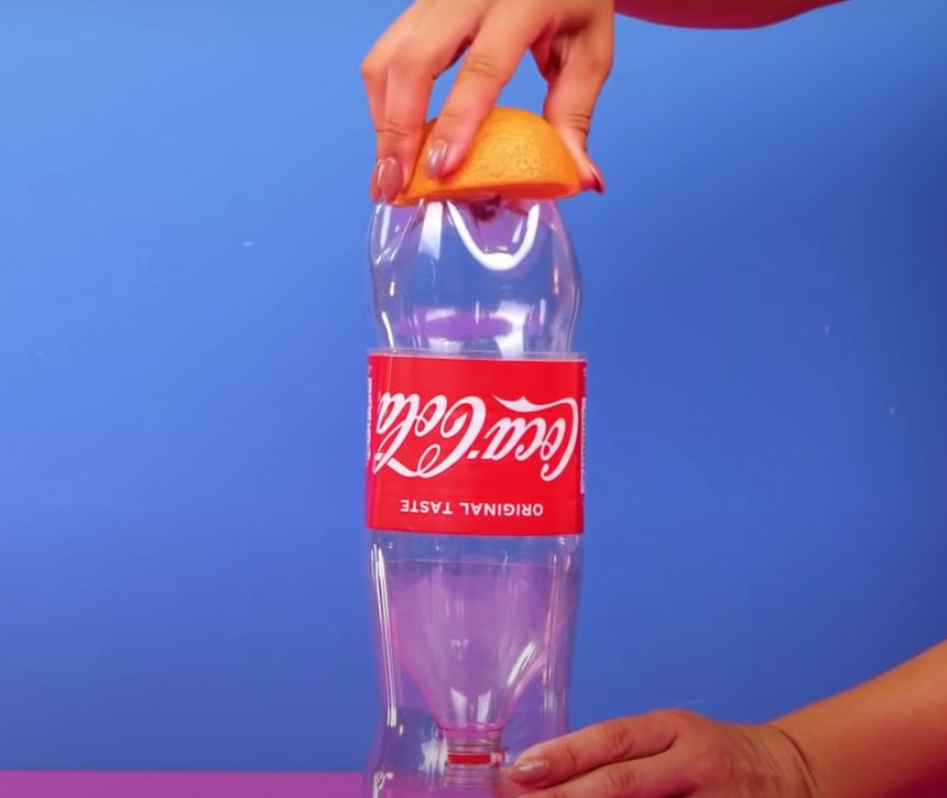 Ņem augli un to spiež pret pudeles apakšējo daļu (skatīt attēlu zemāk). Šādi sula notecēs gar pudeles daļas sāniem un caur apgriezto kakliņu iepildīsies apakšdaļā.