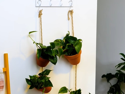 1. Sākotnēji atrodiet sienu pie kuras vēlaties novietot puķu podus. Pie sienas pieskrūvējiet āķus vai drēbju pakaramos.