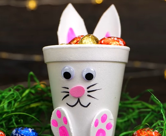 1. Uz vienas glāzītes uzzīmējiet divas lāsveida formas zaķu austiņas, divu ovālus jeb ķepiņas un vienu mazu aplīti, kas būs deguns. Izgrieziet visas uzzīmētās formas.