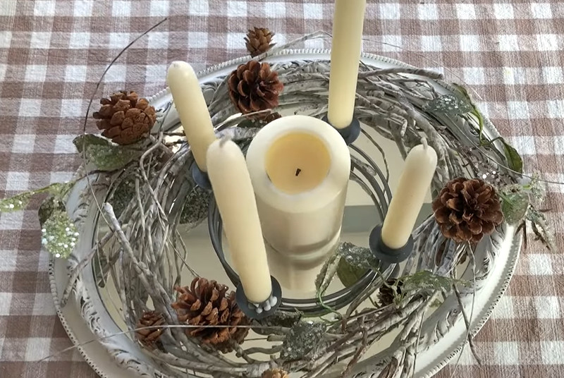 2. Apkārt svečturim izvietojiet dekorācijas, piemēram, žagariņus un čiekurus.