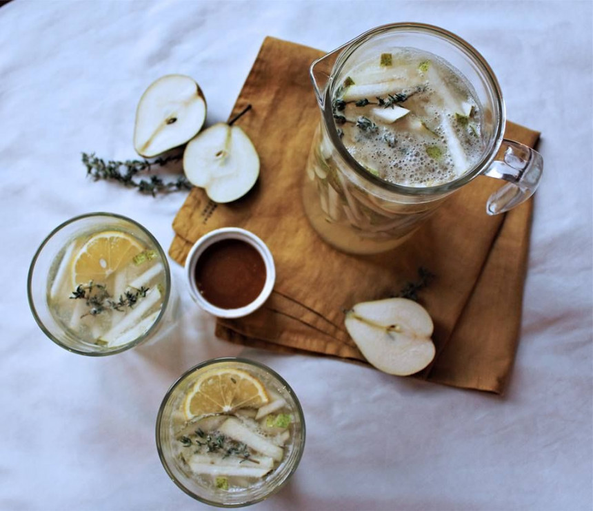 Pagatavošana: Bumbierus nomazgā, izņem serdes un pašus sagriež smalkās strēmelītēs. Apslaka ar citrona sulu, pievieno karameļu mērci, apmaisa un liek lielā krūkā. Pielej baltvīnu, sidru un visu samaisa. Pievieno timiāna zariņus un liek ledusskapī nostāvēties 2-6 stundas. Bauda atdzesētu, pēc vēlēšanās pievienojot ledu. Karameļu mērce. 100 g baltā cukura un 100 ml saldā krējuma. Cukuru kausē katliņā ar biezu dibenu līdz dzintara krāsai. Pielej saldo krējumu (krējums uzreiz sāks burbuļot, jo cukurs būs ļoti karsts, tāpēc jālej uzmanīgi), samaisa līdz viendabīgai konsistencei un atdzesē līdz istabas temperatūrai.