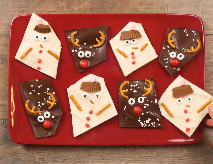 Tad darbini savu fantāziju! Izveido sniega vīrus - uz baltās šokolādes izkārto vairākus konfekšu "acu" pārus, kuriem pievieno konfekšu podziņas, bet no cepumu salmiņiem - rokas.