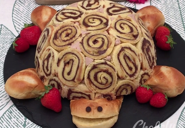 13. Visbeidzot, virs bagetēm, kas domātas kā bruņurupuča kājiņas, uzliec iepriekš izveidoto maizes kārtojumu. Tad paņem šokolādes "čipsus" un iestiprini acu vietā. Ja vēlies, šķīvi vari dekorēt ar zemenēm. Labu apetīti!