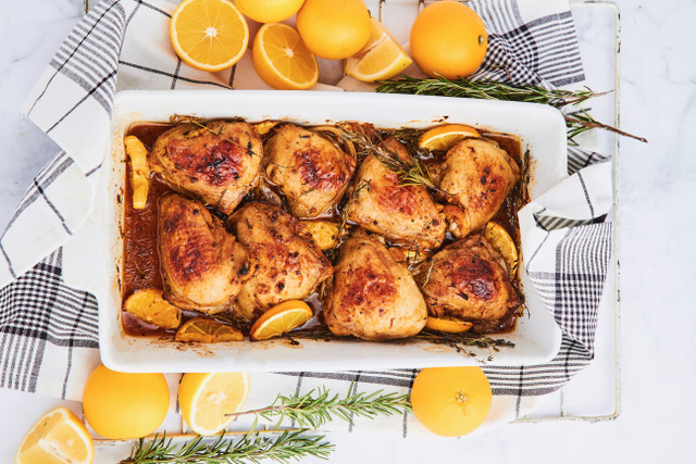 Sajauc 1 apelsīna sulu un norīvētu miziņu ar pārējām sastāvdaļām un ierīvē vistas šķiņķīšus. Sakarsē cepeškrāsni līdz 180 grādiem. Liek visu cepeštraukā un pievieno otru apelsīnu, sagrieztu šķēlēs. Cep 1 stundu. Pasniedz ar iemīļotākajām piedevām, kartupeļu biezeni, kuskusu, rīsiem vai bulguru.