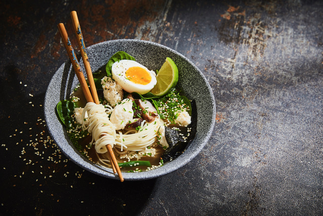 Gatavo buljonu, pievieno visas sastāvdaļas un ļauj tvaicēties un sajaukties garšām vismaz 30 minūtes. Paralēli sagatavo knēdeļus: samal visas sastāvdaļas krēmīgā masā un liec uz 20 minūtēm ledusskapī. Vāri olas 5 minūtes un nolobi. Nokās buljonu, pārliecinies par garšu, vai ir pietiekami pikanta un vai pietiek laima skābuma. Buljonu liec atpakaļ sildīties. Pievieno sagrieztas sēnes un pākšu pupiņas. Ar divām karotēm veido knēdeļus un vāri tos 2 minūtes buljonā. Kad knēdeļi uzvārījušies, liec buljonam klāt nūdeles. Pasniedz traukos, pievienojot uz pusēm pārgrieztu olu, piparus un mazākos gabaliņos sagrieztu nori lapu.
