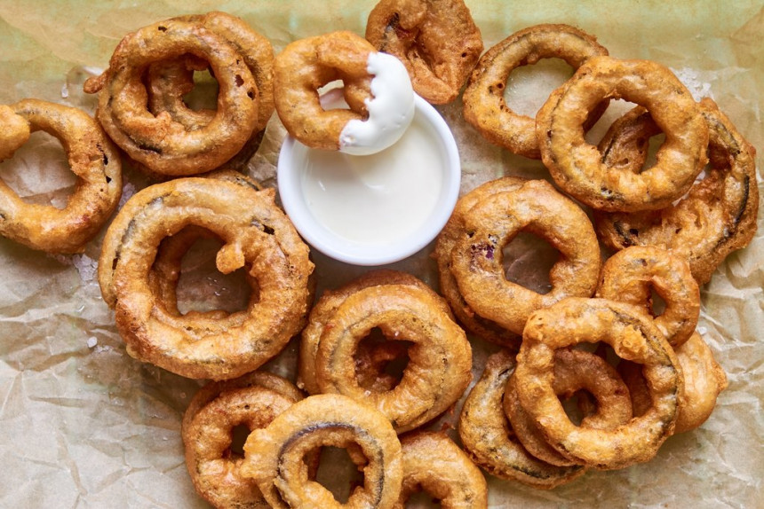 Ar dakšiņu vai standziņām katru sīpola gredzenu iemērcē mīklas maisījumā un liec karstā eļļā.