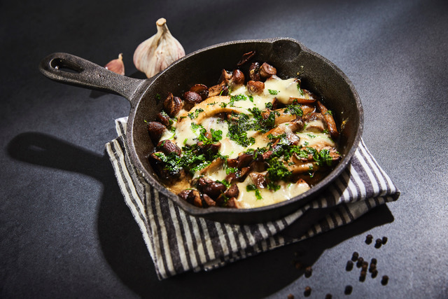 Sakarsē krāsni grila režīmā. Pannā, kuru var likt krāsnī, uzkarsē eļļu un uz vidējas liesmas apcep sēnes ar sāli, timiānu, anīsu un ķiplokiem. Kad tās jau nāk gatavas, uzgriez lielāku liesmu, lai sēnes skaisti apbrūnē. Noņem no plīts, pievieno mocarellu, uzkaisi pētersīļus un baziliku un liec krāsnī grila režīmā, līdz siers izkusis un burbuļo. Pasniedz uzreiz vai nu kā pamatēdienu, vai kā piedevu gaļas ēdieniem. Ideāli garšo ar svaigu maizīti.